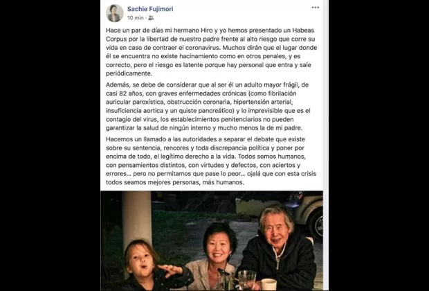 Sachie Fujimori, a su vez, mencionó que "se debe considerar que su padre es un adulto mayor frágil, de casi 82 años, con graves enfermedades crónicas (como fibrilación auricular paroxística, obstrucción coronaria, hipertensión arterial, insuficiencia aórtica y un quiste pancreático)".