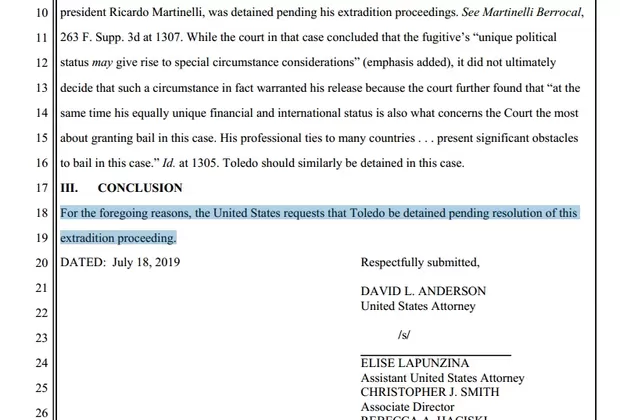 “Los Estados Unidos solicitan que Toledo esté detenido en espera de la resolución de este procedimiento de extradición”, refiere el documento oficial con fecha 18 de julio, al que tuvo acceso exclusivo América Noticias.