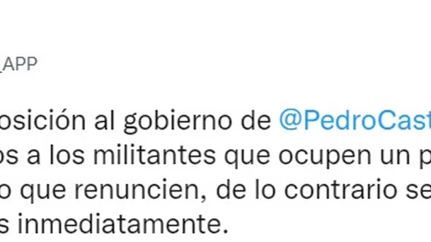 “APP es oposición al gobierno de Pedro Castillo. Exhortamos a los militantes que ocupen un puesto en el Ejecutivo que renuncien, de lo contrario serán expulsados inmediatamente”, se lee en la publicación.