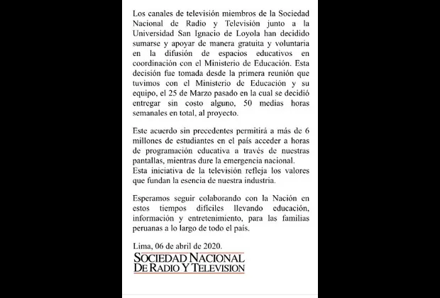 A la iniciativa se sumaron los canales 2, 4, 5, 9 y 13, de la Sociedad Nacional de Radio y Televisión (SNRTV), quien dio detalles acerca de la medida que se dio tras acuerdo con el Minedu el pasado 25 de marzo.