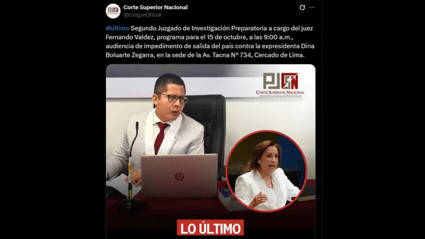 El Segundo Juzgado de Investigación Preparatoria Nacional, a cargo del juez Fernando Valdez, ha programado para el próximo miércoles 15 de octubre a las 9:00 a.m. la audiencia de impedimento de salida del país contra la expresidenta Dina Boluarte.