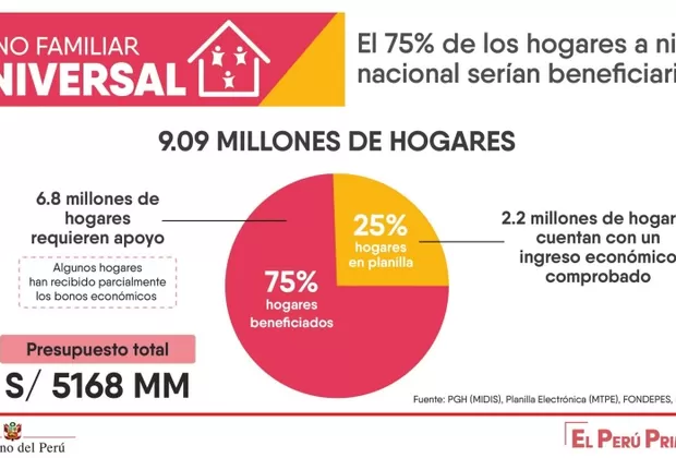 Explicó que este bono familiar universal ampliará el alcance de los actuales subsidios a familias vulnerables y trabajadores independientes. Esta iniciativa tiene la finalidad de alcanzar un universo de 6.8 millones de familias, para lo cual el Ministerio de Economía y Finanzas (MEF) ha estimado un presupuesto de S/ 5,168 millones.