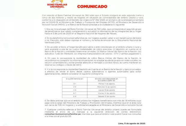 Hoy, martes 11 de agosto se inicia el pago que corresponde al segundo grupo de beneficiarios que validó, complementó o actualizó la información de los integrantes de su hogar hasta el 3 de junio de 2020 en el Registro Nacional de Hogares del Reniec. A continuación el comunicado completo del Ministerio de Desarrollo e Inclusión Social: