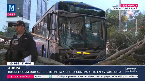 El bus del Corredor Azul, que trasladaba personal de la Autoridad de Transporte Urbano (ATU), terminó chocando contra un árbol al borde de la vía. La unidad llevaba trabajadores encargados de colocar conos y señales en el corredor. Uno de ellos resultó con golpes leves tras el impacto.