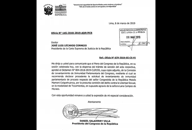 Ante este pronunciamiento del Ministerio Público, el Congreso de la República, informó a América Noticias, que el pasado 8 de marzo envió a la presidencia de la Corte Suprema de Justicia un oficio adjuntando el dictamen N°004-2018-2019-CLI/CR, de la Comisión de Levantamiento de Inmunidad Parlamentaria.