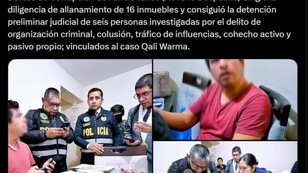 Un megaoperativo liderado por el Ministerio Público y la Policía Nacional del Perú permitió el allanamiento de 16 viviendas y la detención preliminar de seis personas vinculadas a presuntos actos de corrupción en el programa de alimentación escolar Qali Warma.