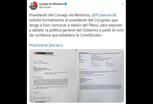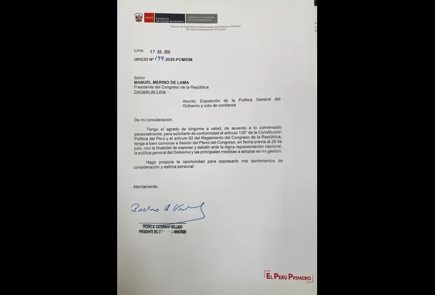 Pedro Cateriano, titular de la Presidencia del Consejo de Ministros (PCM), envió un oficio al presidente del Congreso, Manuel Merino, en el que le solicita formalmente a que convoque a una sesión del Pleno del Parlamento, para presentar las políticas públicas del Gobierno y pedir el voto de confianza.