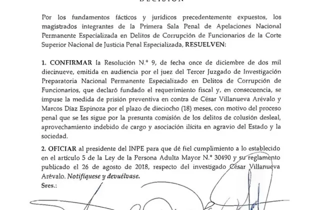 La Corte Superior de Justicia Especializada en Delitos de Crimen Organizado, a través de la Sala Penal Anticorrupción, confirmó la prisión preventiva de 18 meses contra César Villanueva, ex primer ministro, y Marcos Díaz Espinoza por el delito de colusión desleal y otros, como parte de la investigación por el caso Odebrecht.