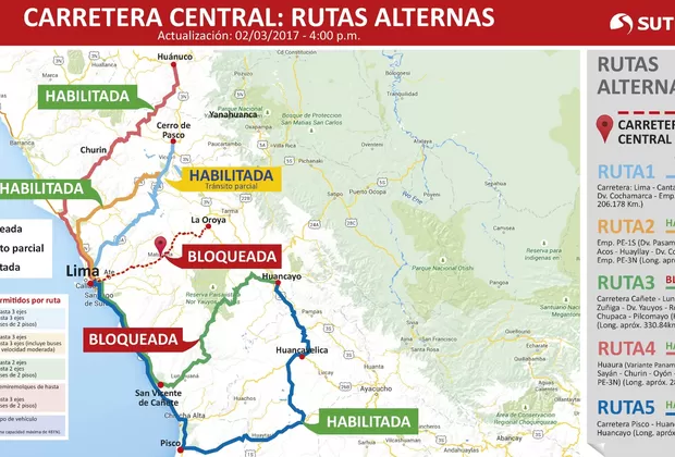 Ante esta situación, la Superintendencia de Transporte Terrestre de Personas, Carga y Mercancía (Sutran) comunicó el cierre total de la Carretera Central desde las 5 de la tarde de hoy (jueves) hasta las 5 de la mañana del viernes 3 de marzo, como medida preventiva frente a la intensa lluvia y nuevos desprendimientos de rocas de gran tamaño y lodo.