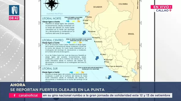 El Instituto Nacional de Defensa Civil (Indeci) informó que 112 puertos del litoral peruano han sido cerrados por oleajes de ligera a fuerte intensidad. Según el aviso oceanográfico Nº 38 emitido por la Dirección de Hidrografía y Navegación (Dihidronav), el fenómeno continuará al menos hasta el miércoles 27 de agosto.