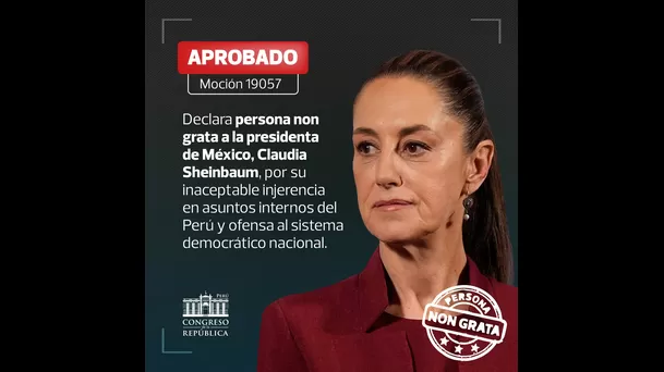 El pleno del Congreso aprobó con 63 votos a favor, 34 en contra y 2 abstenciones una moción que declara como persona no grata a la presidenta de México, Claudia Sheinbaum, debido a su inaceptable injerencia en asuntos internos del Perú y una ofensa al sistema democrático nacional.