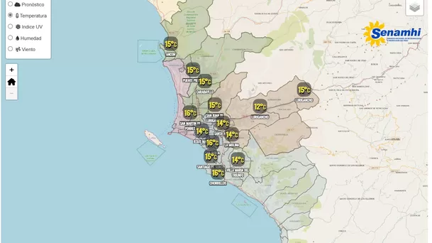 En Lima Norte y Sur, las temperaturas varían un máximo de 16 y un mínimo de 14 grados. No obstante, el registro cambia en la tarde, influenciado por la cercanía al mar hacia el oeste y la altitud hacia el este.