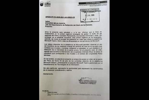 La identificación se dio tras el reporte del área de Grabaciones del Congreso, donde precisaron que "durante la intervención del congresista (Omar) Chehade Moya se activa el micrófono que corresponde a las iniciales y al nombre del congresista (Jhosept) Pérez Mimbela”.