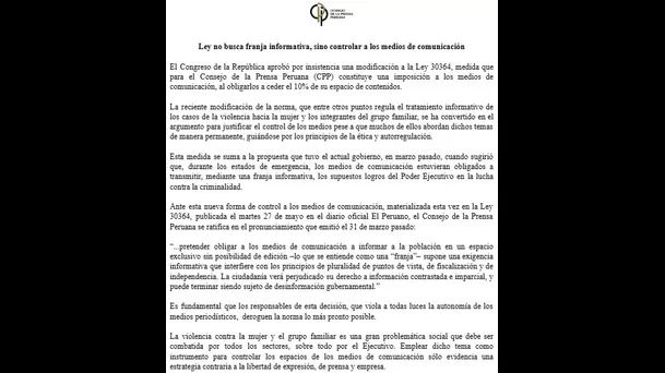 El Consejo de la Prensa se reafirma en su pronunciamiento emitido el 31 de marzo pasado, donde ya alertaba sobre el riesgo de que se impongan contenidos sin libertad editorial.