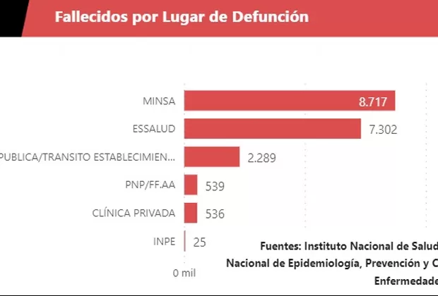 Según la actualización de la Sala Situacional COVID-19 del Ministerio de Salud al primer día de agosto, 8 717 muertes se registraron en hospitales del Ministerio de Salud y 7302 en centros de EsSalud. Ambos lugares son los que concentran mayor cantidad de decesos.
