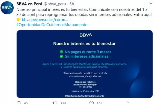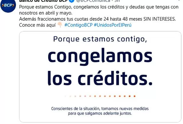 Por su parte, el banco BBVA anunció que sus clientes de tarjetas de crédito y de consumo, así como las micro y pequeñas empresas (Pyme), podrán acogerse al congelamiento de sus cuotas por 90 días, sin intereses adicionales.