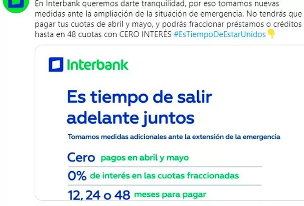 A su vez, el Interbank ofreció el pago cero para las cuotas de abril y mayo de los créditos otorgados a sus clientes, con un fraccionamiento a 12 meses para las tarjetas de crédito y de 48 meses para préstamos hipotecarios.