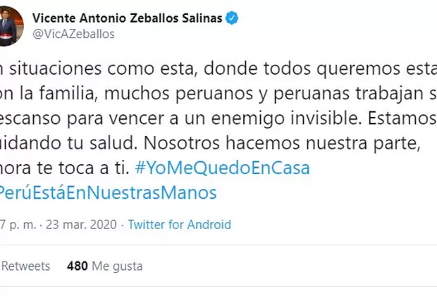 Vicente Zeballos, titular de la PCM, dijo vía twitter, que “en situaciones como esta, donde todos queremos estar con la familia, muchos peruanos trabajan sin descanso para vencer a un enemigo invisible. Estamos cuidando tu salud. Nosotros hacemos nuestra parte, ahora te toca a ti”.