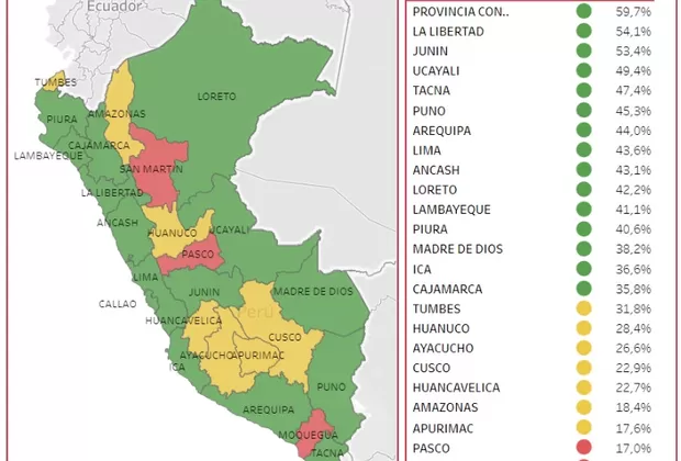 Al igual que la región Callao, en verde figuran La Libertad (54,1%), Junín (53,4%) Ucayali (49,4%) Tacna (47,4%) Puno (45,3%), Arequipa (44,0%), Lima (43,6%), Áncash (43,1%) Loreto (42,2%), Lambayeque (41,1%), Piura (40,6%), Madre de Dios (38,2%), Ica (36,6%) y Cajamarca (35,8%).