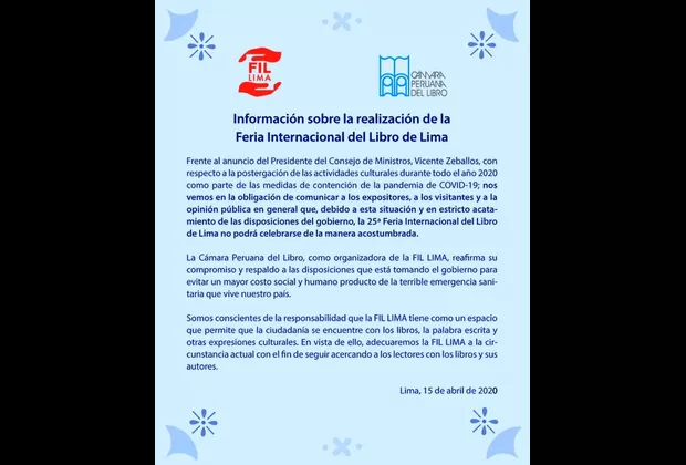 "Nos vemos en la obligación de comunicar a los expositores, a los visitantes y a la opinión pública en general que, debido a esta situación y en estricto acatamiento de las disposiciones del gobierno, la 25ª Feria Internacional del Libro de Lima no podrá celebrarse de la manera acostumbrada", manifestaron.