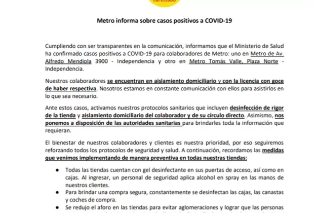 La cadena de supermercados Metro Cencosud confirmó dos nuevos casos de coronavirus entre su personal de las tiendas de Alfredo Mendiola y Tomás Valle (Plaza Norte).