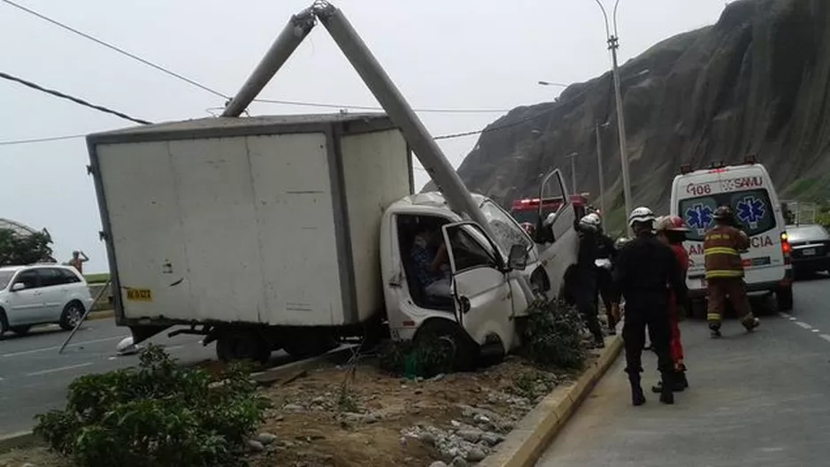 Dos personas resultaron con cortes y fracturas luego de que el camión frigorífico en el que viajaban se despistara y estrellara contra un poste de alumbrado público frente a la playa Tres Picos en la Costa Verde, distrito de Miraflores.
