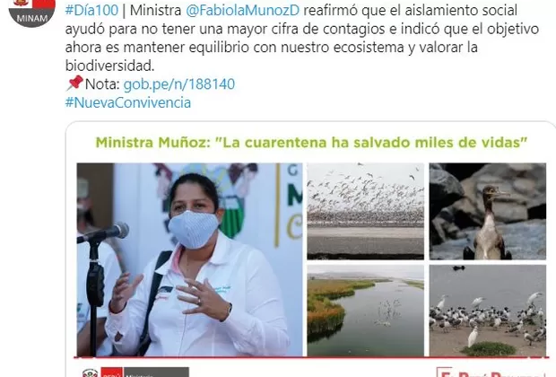 La titular del Ministerio del Ambiente, Fabiola Muñoz, hizo un balance al cumplirse 100 días de cuarentena en el Perú. Destacó que el período de aislamiento produjo un respiro a la naturaleza, el cual ha sido registrado trabajando de manera articulada con los gobiernos regionales.