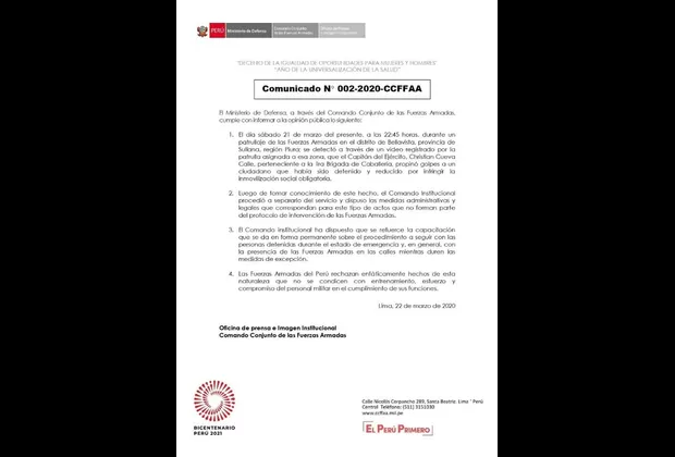 El Comando Conjunto de las Fuerzas Armadas informó la separación del capitán del Ejército, Christian Cueva Calle, miembro de la 1ra Brigada de Caballería. Él fue grabado golpeando a un joven que fue intervenido por no acatar la orden de inmovilización social obligatoria en Piura.