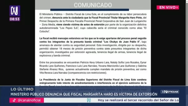 El Ministerio Público denunció que la fiscal provincial Margarita Haro Pinto está siendo víctima de amenazas y extorsiones por parte de una presunta banda criminal. La situación genera preocupación por la seguridad de los fiscales y por el impacto que estas amenazas pueden tener sobre las investigaciones en curso.