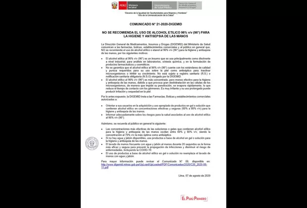 A través de un comunicado oficial, la Dirección General de Medicamentos, Insumos y Drogas (Digemid) desestimó el uso de alcohol etílico de 96 grados para la higiene y antisepsia de las manos.