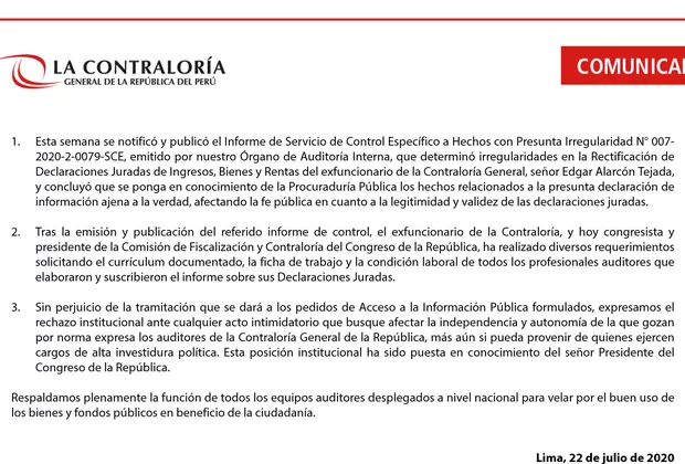 Asimismo, rechazaron "todo acto intimidatorio" al equipo a cargo del documento que señaló que Alarcón Tejada no debió asumir el cargo de vicecontralor en el año 2016 ante irregularidades en las declaraciones juradas que presentó.