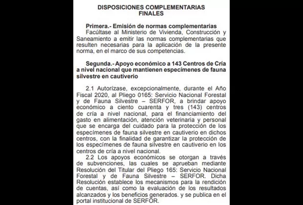 El Decreto de Urgencia N° 061-2020 autoriza la entrega de 3.9 millones de soles al Serfor para financiar los costos de alimentación, atención veterinaria y del personal que cuida a los animales silvestres.