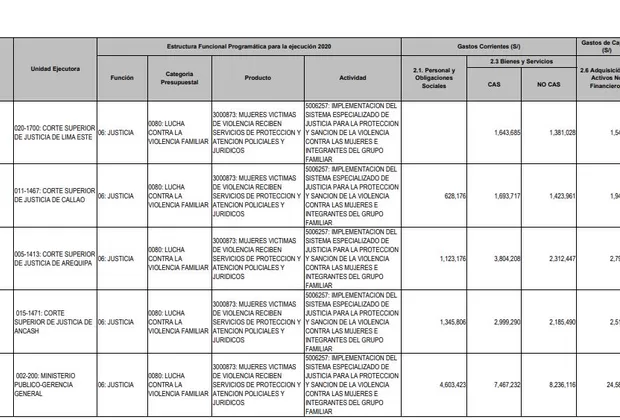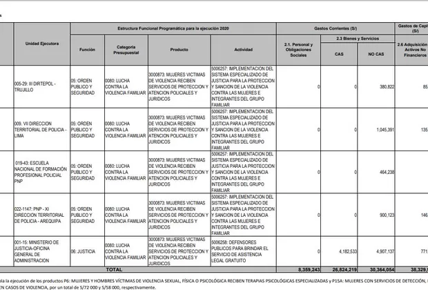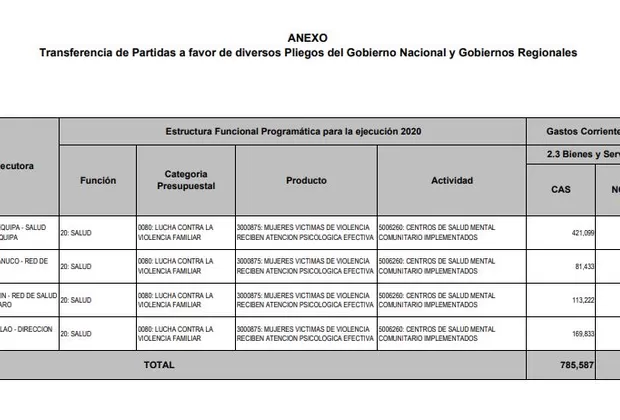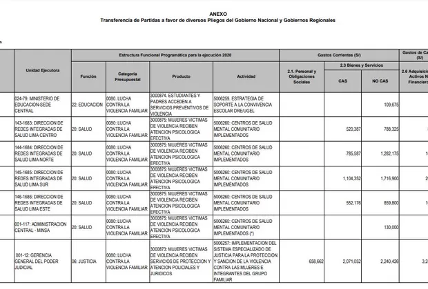 El Decreto Supremo N°110-2020-EF señala que estos recursos, provenientes del pliego del Ministerio de la Mujer y Poblaciones Vulnerables, equivale a alrededor del 35% del monto total de partidas distribuidas también a otras carteras del Ejecutivo como Justicia, del Interior, Educación y Salud, así como al Ministerio Público y los gobiernos regionales.