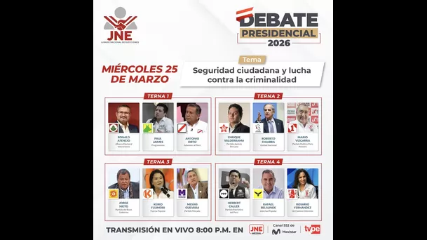 Esta fecha cierra el primer bloque del debate presidencial desarrollado entre el 23 y el 25 de marzo. En esta etapa, los candidatos exponen propuestas sobre seguridad ciudadana, lucha contra la criminalidad y combate a la corrupción.