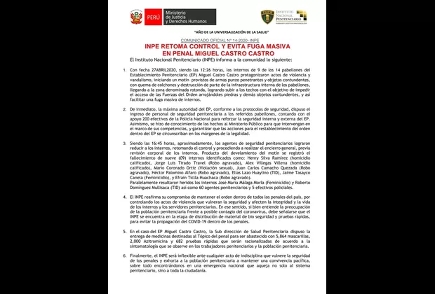 El INPE confirmó este martes 28 de abril que ascendieron a 9 las víctimas mortales del motín ocurrido el día previo en el penal Castro Castro, en San Juan de Lurigancho.