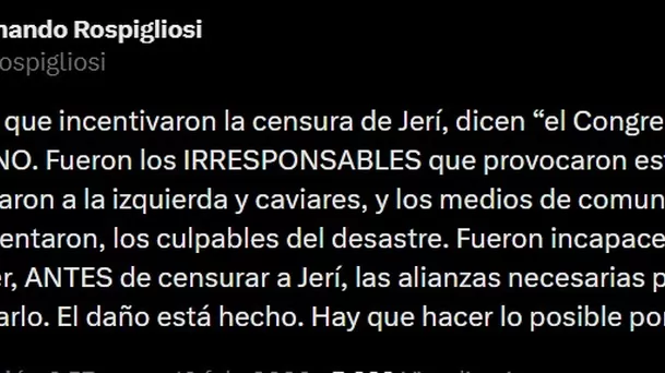 El legislador indicó que quienes promovieron la censura fueron incapaces de establecer, antes de retirar a Jerí, las alianzas necesarias para reemplazarlo. Señaló que el daño ya está hecho y que ahora corresponde hacer lo posible por mitigarlo.