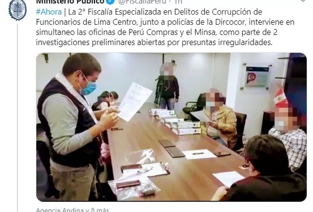 El Ministerio Público realiza diligencias en simultáneo en las oficinas del Ministerio de Salud (Minsa) y Perú Compras. Las intervenciones se realizan ante las investigaciones por la adquisición de pruebas de descarte COVID-19.