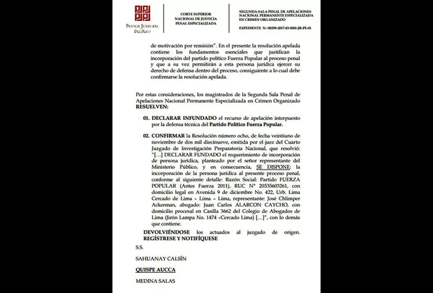 En el documento, la Sala señala que “la resolución apelada contiene los fundamentos esenciales que justifican la incorporación de Fuerza Popular al proceso penal y que a su vez permitirán a esta persona jurídica ejercer su derecho de defensa dentro del proceso, consiguiente a lo cual debe confirmarse la resolución apelada”.