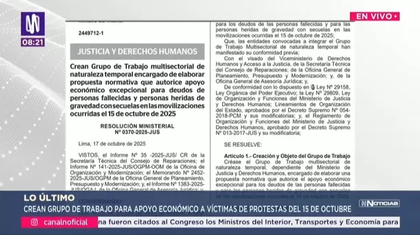 El grupo de trabajo elaborará una propuesta normativa que permita brindar un apoyo económico a los deudos de fallecidos y personas con heridas graves y secuelas por las protestas. Esta propuesta podría convertirse en una norma que habilite la entrega excepcional de fondos estatales.