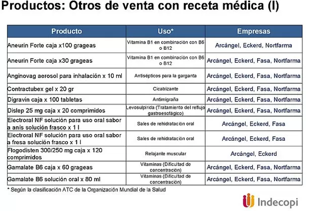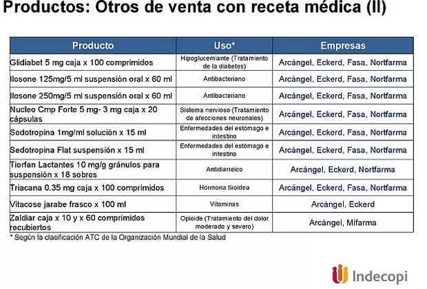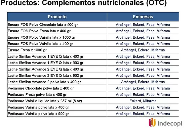 Se trata de las cadenas Arcángel (Albis S.A.), Fasa (Farmacias Peruanas S.A.), Inkafarma (Eckerd Perú S.A.), Mifarma (Mifarma S.A.) y Felicidad (Nortfarma S.A.C.).