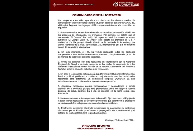 En un comunicado la Dirección Regional de Salud de Lambayeque informó que los cementerios y los crematorios locales llegaron al máximo de su capacidad.