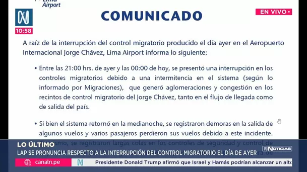 Lima Airport Partners (LAP) emitió un comunicado luego de la interrupción del control migratorio en el Aeropuerto Internacional Jorge Chávez entre la noche del sábado y la madrugada del domingo. La falla técnica provocó largas colas, pérdida de vuelos y aglomeraciones tanto en salidas como en llegadas internacionales.