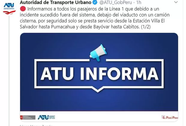La Autoridad de Transporte Urbano (ATU) informó que debido a un incidente sucedido fuera del sistema, debajo del viaducto con un camión cisterna, por seguridad solo se presta servicio desde la estación Villa El Salvador hasta Pumacahua, y desde Bayóvar hasta Cabitos.