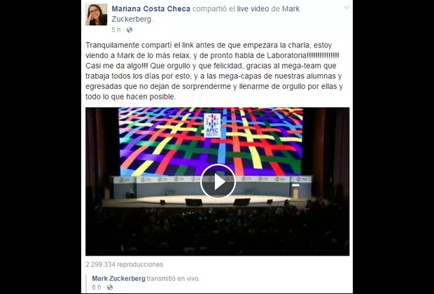 “Tranquilamente compartí el 'link' antes de que empezara la charla, estoy viendo a Mark (Zuckerberg) de lo más relax y de pronto habla de 'Laboratoria'. Casi me da algo. Qué orgullo y qué felicidad”, escribió Mariana en su post.