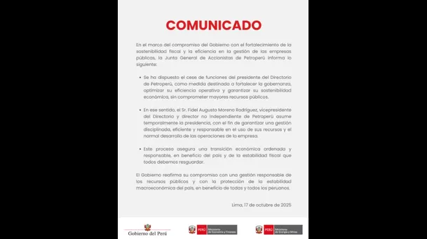El comunicado ministerial señala que la transición será llevada a cabo de forma ordenada y responsable, garantizando el normal desarrollo de las actividades de Petroperú sin afectar sus compromisos ni su rol estratégico en el abastecimiento energético del país.