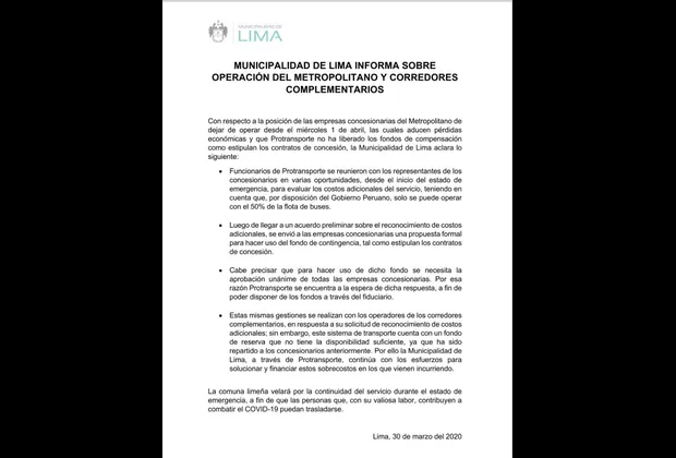 Un comunicado del operador del Metropolitano alertó a los usuarios. La comunicación indican que no podrían operar el 1 de abril pues no pueden acceder al fondo de emergencia.