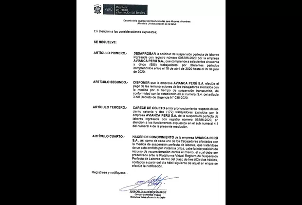 Sin embargo, el MTPE resolvió desaprobar la solicitud presentada por Avianca Perú y disponer que ésta "efectúe el pago de las remuneraciones de los trabajadores afectados con la medida por el tiempo de suspensión transcurrido", de acuerdo al dictamen difundido por el legislador Daniel Olivares.