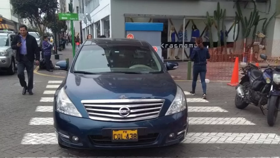 A través de las redes sociales, un transeúnte denunció esta tarde que un auto de placa CQL-438, bloqueó el paso peatonal de la cuadra 1 de la calle Porta, en el distrito de Miraflores.