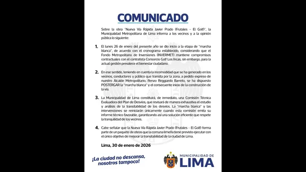 La Municipalidad de Lima indicó que esta medida busca garantizar una solución de movilidad que no afecte la tranquilidad de los vecinos ni la fluidez del tránsito vehicular. La obra forma parte de un paquete de proyectos que la comuna prevé ejecutar para mejorar la infraestructura vial en la capital.