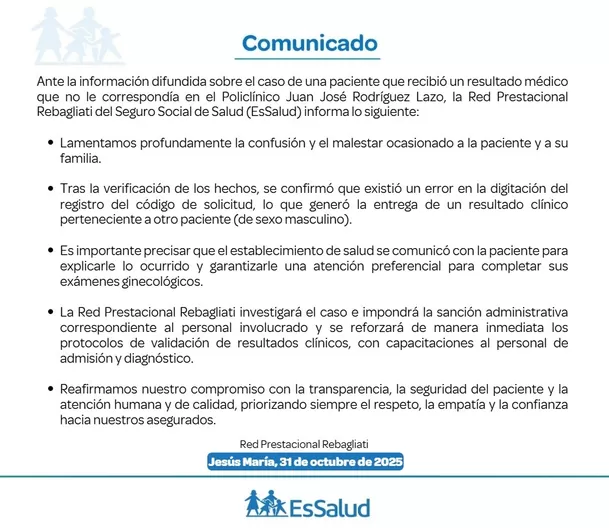 Por su parte, la institución publicó un comunicado sobre el caso y lo calificó como un "error de digitación". Además, indicó que aplicará las respectivas sanciones administrativas a quienes resulten responsables del resultado clínico. Por último, EsSalud reafirmó su "compromiso con la transparencia, la seguridad del paciente y la atención humana y de calidad".